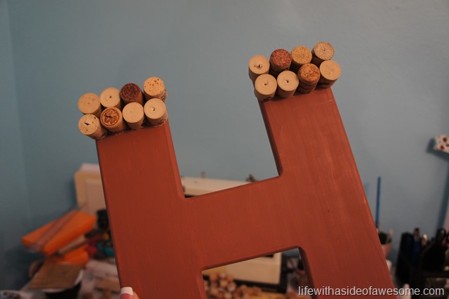 The letter “H” was plain wood so I painted it white and started hot gluing the corks on.  I didn’t start with any pattern or anything but by the time I was nearly done I had this….