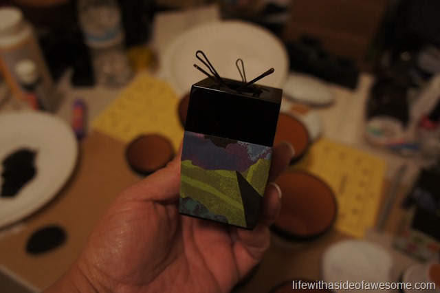 Just before I had it completely closed up, I put in a couple of pennies, a small Hello Kitty rock that I had painted and a bottle cap. It was more for the sound effects than anything. If she does decide to bust it open I wanted at least a couple of little things inside.