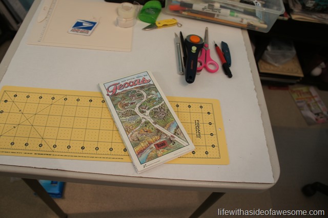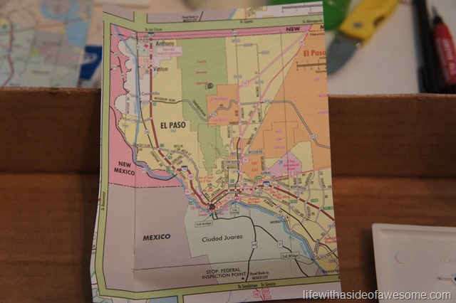The portion of the map I chose has El Paso, where my gramma, and yes I *know* that you don’t spell grandma that way but we do…anyways that’s where my gramma and some relatives live. On it as well as Ciudad Juarez where my dad is from. Like I said, you can cover yours with just about anything. Maps, pages from a book, sheet music, craft paper, fabric…just about anything!