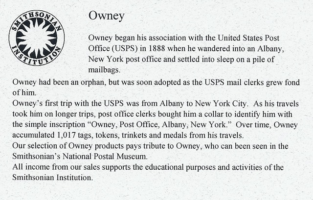 At the top of the escalator, before you head down to the Smithsonian National Postal Museum, there is a statue of Owney greeting you.